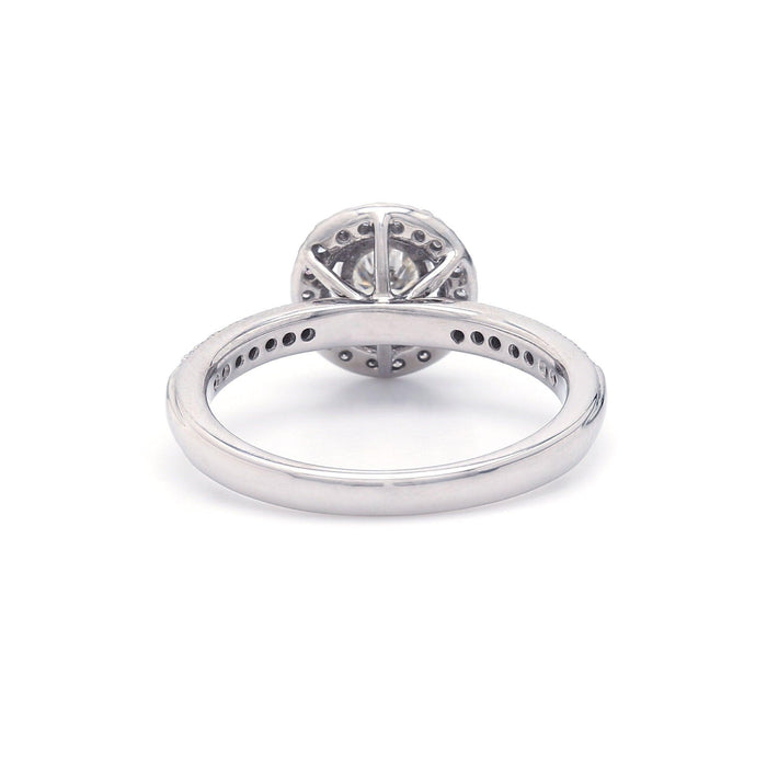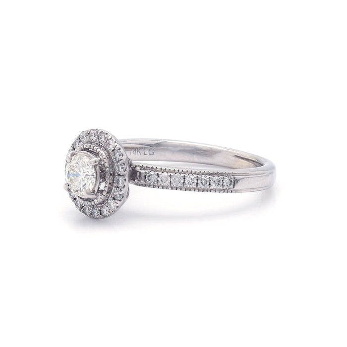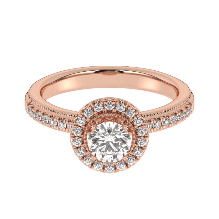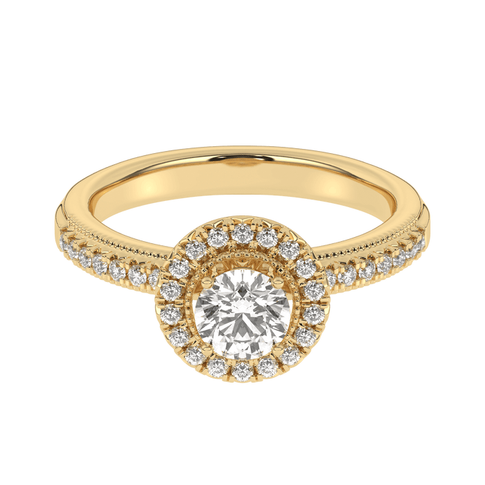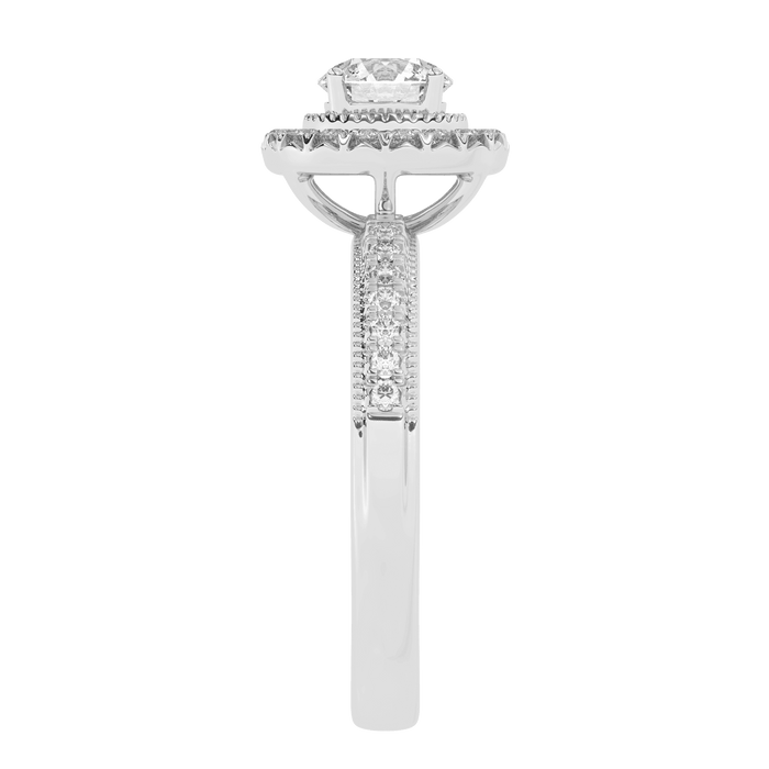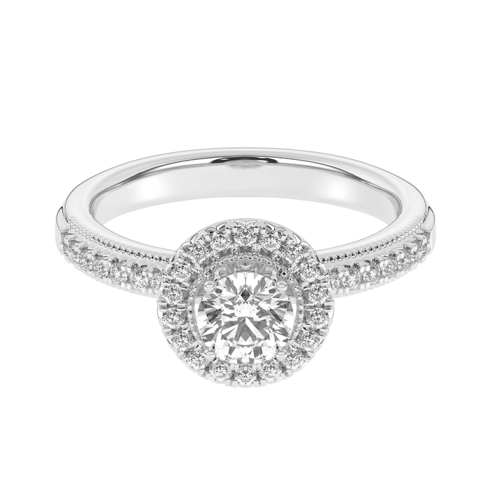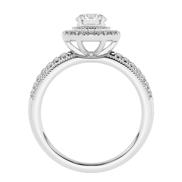 Make that special moment magical with this halo style lab grown diamond engagement setting. Expertly crafted in precious gold or platinum, this sparkling design showcases a the lab grown diamond center stone of your choice bordered with a raised milgrain halo with smaller round accents. Additional accent lab diamonds line the ring's slender shank flanked by a milgrain channel for a total weight of 1/3 carats with F-G VS-SI ranking. Designed to sparkle this engagement ring captivates with lab grown diamonds and a bright polished shine.