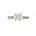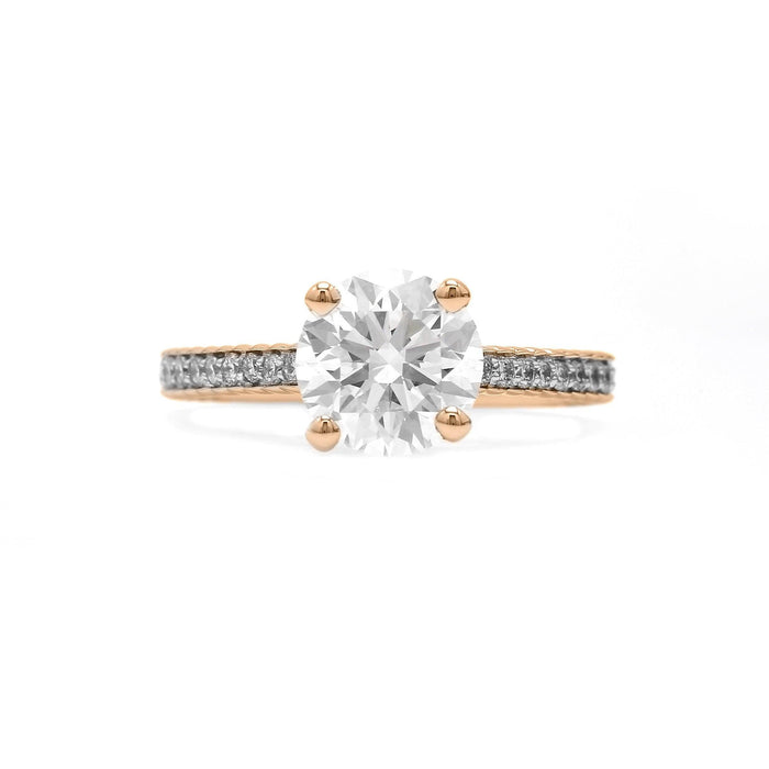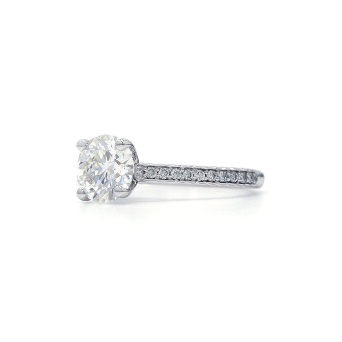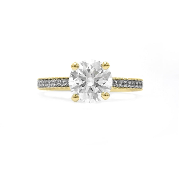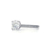 With simplicity and sophistication, this glorious lab grown diamond engagement ring amplifies exquisite style. Crafted in precious platinum or gold, this singular standout piece is set to focus on your center round lab grown diamond stone. It will showcase atop a slender band of shimmering F-G, VS-SI lab diamonds totaling 1/4 carats. Captivating with lab grown diamonds and a bright polished shine and ribbon shank work, this engagement ring is destined to delight.
