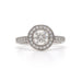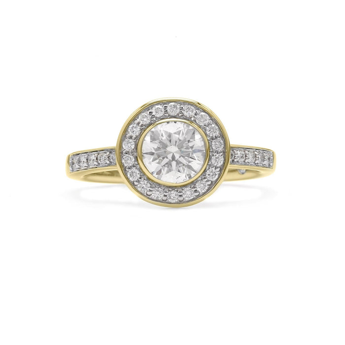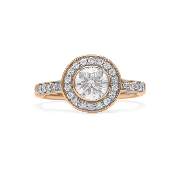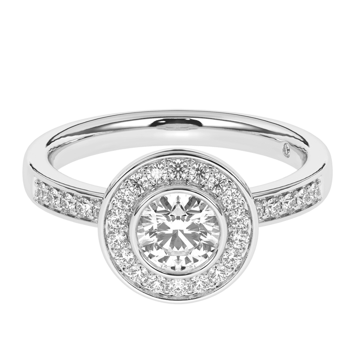 Fashioned in precious gold or platinum, this impressive design highlights a bezel setting for your choice of lab grown diamond, nestled in a contemporary halo. Petite F-G, VS-SI lab diamond accents also line the ring's slender shank, creating a look beyond all compare and totaling 1/4 carat weight. This engagement ring is destined to delight; it's the perfect style for coordinating with different band rings for a creative look.