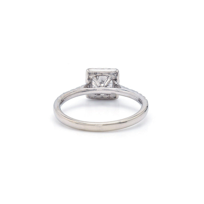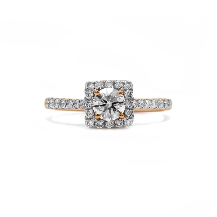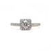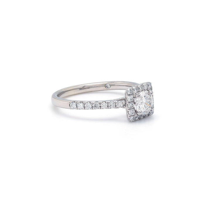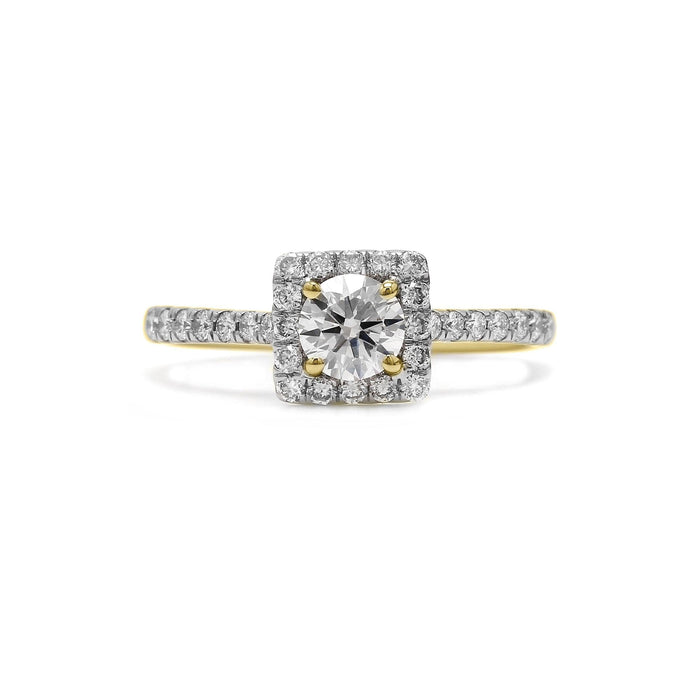 Fashioned in precious gold or fine platinum, this fashionable design highlights the center lab grown diamond of your choice, set into in a lovely accented square halo frame and lab grown diamond accents line the ring's slender tapered shank totaling 3/8 carat weight, creating a look beyond all compare. This engagement ring is destined to delight and is the perfect style for coordinating with different band rings for a creative look.